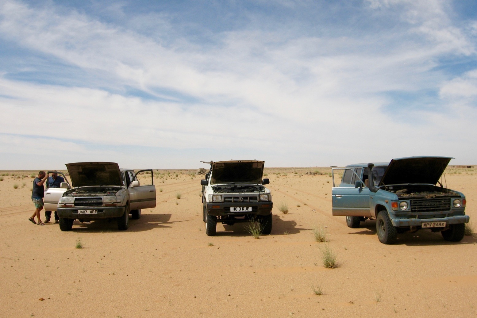 Inspired by our good progress so far we checked the tires were down to one bar and set off in the cool after dawn towards the first ridge, paused and turned left and then right to slip between the wind-carved summits. Another corridor, another sand slope and, always keeping to the high banks to keep a decent in hand should the sand soften, I worked my way around the barriers. When stuck I backed out while someone else went off to explore an alternative route. We worked out way south with surprisingly little drama but as I hopped from dune to dune a light mechanical knock I’d dismissed as axle play became increasingly prominent. Revving in neutral proved that is wasn’t some worn CV. I called Mohamed over for a listen. Tapping the throttle his face dropped, it was a sound he knew too well: a crankshaft bearing about to meet its end.