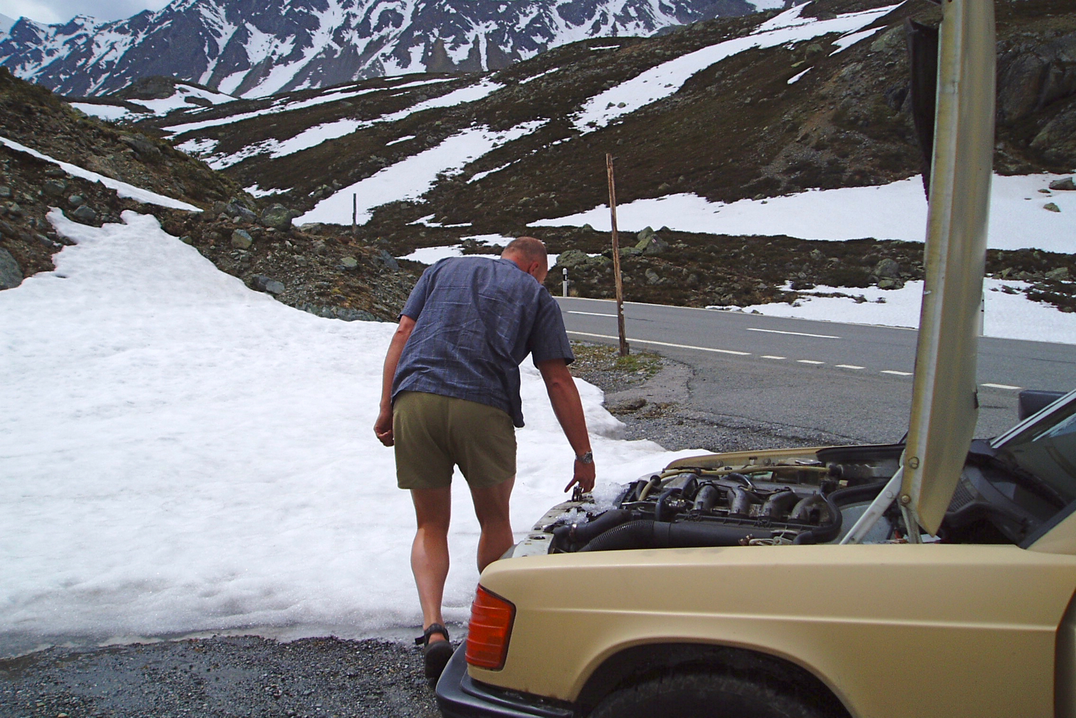 Turned out the worn steering knuckle had had popped out. We deliberated over dumping it, but that would cost dearly in tidy Switz, so the new part arrived at the village next day and we carried on. Now running the engine on new gearbox oil (the mechanic had to be restrained at the very idea! He thought the car was a rusty abomination), the passes where crawled over in one go, though still inching into the red and with heater fans on stun. Then in Italy the alternator went, the fan could not blow, the windows or indicators would not work. Mulling it over on the autostrada and through Slovenia, unsure what would break next, we decided to try and flog it or just dump it the next time the engine stopped.