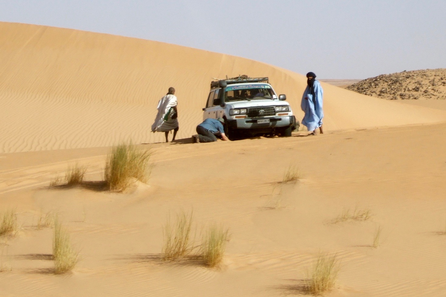 He turned up a day later outside town but too scared to come in. Despite adopting the shaven-headed Moorish appearance and ubiquitous blue robe, Mohamed’s Algerian ID had given him a rough time through southern Mauritania. And that wasn’t all. Following rains and tyre-destroying double punctures he’d also knocked out his low range and subsequently stressed his clutch on the way past Timbuktu. Then the guide he’d lined to lead us across eastern Mauritanian had been recognized as a former rebel and was ejected from Mauritania where he was wanted for a raid. Successive checkpoints had cleaned Mohamed out forcing him to drive by night to avoid the bribery, but the replacement guide he’d hired to get him to Atar was out of his depth. Or so the story went… Back home many had warned him that the crossing was not worth the risk, even for a free VX, but to his credit Mohamed too saw the simple appeal of a desert adventure.
