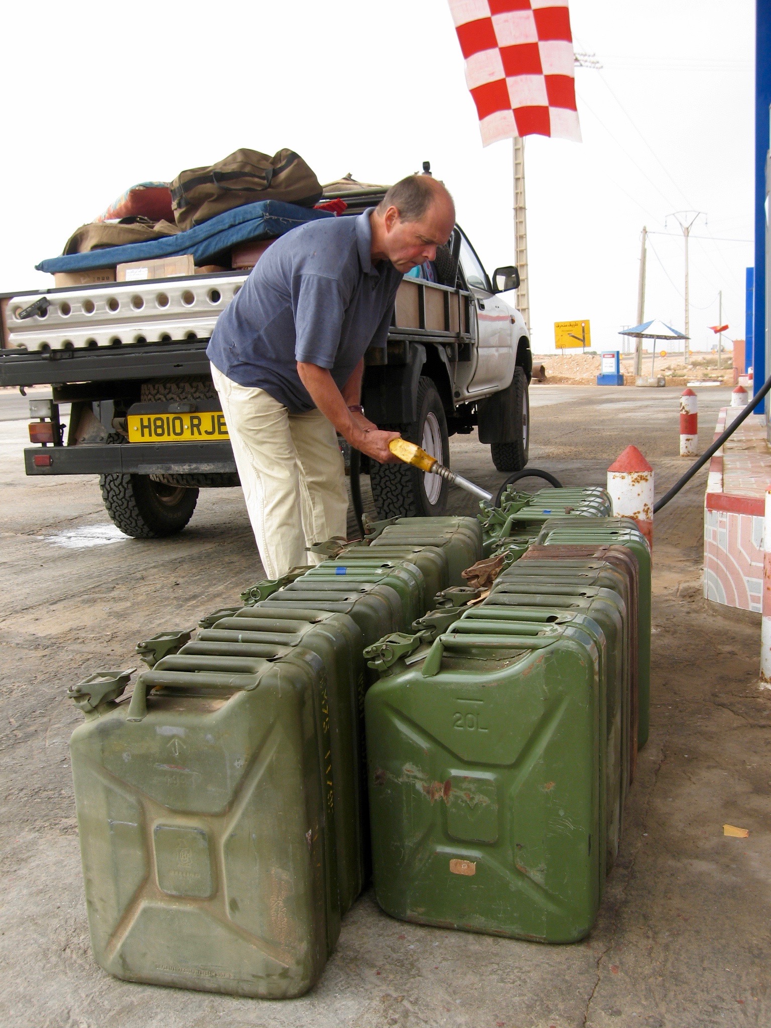 With out man in the UK on standby we settled back for the long drive to the Mauritanian border. Just south of Layounne we filled all our tanks with the last cheap fuel from Moroccan-controlled Western Sahara. I’d picked up an 50-gallon drum for nothing while Ron had ‘tiled’ his 60 with a carpet of jerricans. Roger and Sue had a built-in 400-litre set up. If the pump attendant was on a commission he was having a pretty good day, while for us it was an opportunity to find out how our rides performed at near-maximum payload. With relief my Taro still managed to pull up the odd incline without protest. Perhaps the Sand Sea would not be the death of it after all…
