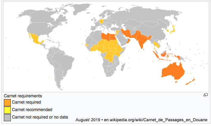 Carnets were designed to stop a vehicle being imported and sold without paying huge import taxes. Most overlanders aren’t intent on selling their vehicles abroad, and most countries in the world are content to stamp your passport with your vehicle details or issue their own inexpensive temporary vehicle importation permit (TVIP) which adds up to the same thing as a CPD. Fewer than a dozen countries demand them (see map). You can go right through the Americas, northwest Africa and across northern or around Southeast Asia without a CPD.