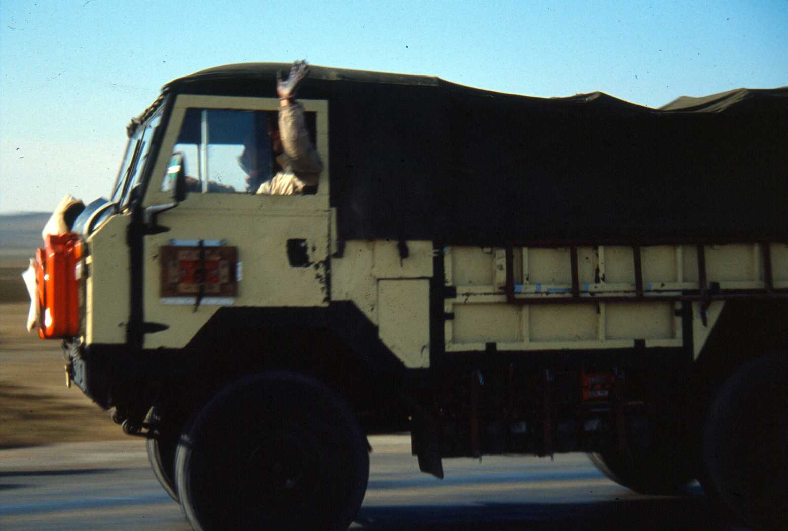I persuaded them to part re-inflate the tyres but all my gear was getting either crushed by the drums or soaked in diesel. As the side gates bent inward, the ropes slackened and the car beat itself up. I’d have to crawl out of the window, edge over to the MAN’s cab like Indiana Jones and thump on it until they stopped. They’d hop out and hang off the ropes to get them good and tight against the creaking side gates. It was painful to watch, but on the move the grunt of the 240-hp truck was something to behold. Rated at 19 tons but carrying only a fraction of that and running singles on the dual rear axle, it ground its way over small dunes like a digger.