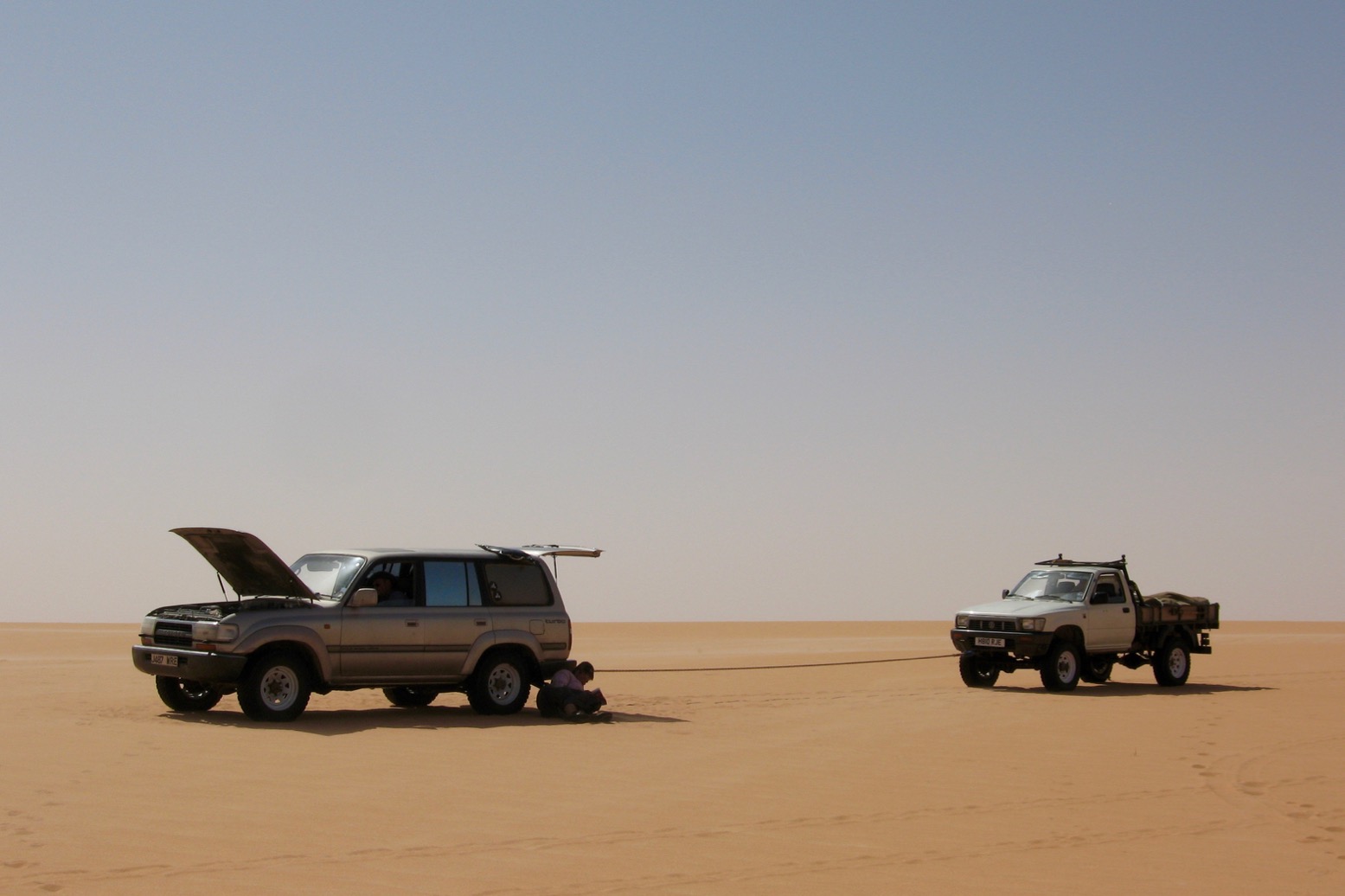 By next morning we were already getting restless, and with the thought of a week’s waiting for the lorry to trundle over the eastern horizon, the tricky topic of towing re-emerged. It was clear that only the VX was capable of it: Sue didn’t mind but Roger was less keen. I saw his point; towing even the lightened ‘gazelle’ across unknown terrain for a thousand kilometres was a shortcut to prematurely ageing the transmission; I knew desert travellers who’d found this out the hard way. In the end though, the call to action prevailed and a fee of a euro per kilometre was agreed. I dished out the masses of fuel I had left and divided my kit for burning or portage. With the pickup as light as it could get, we roped a kinetic line to the VX and set off.