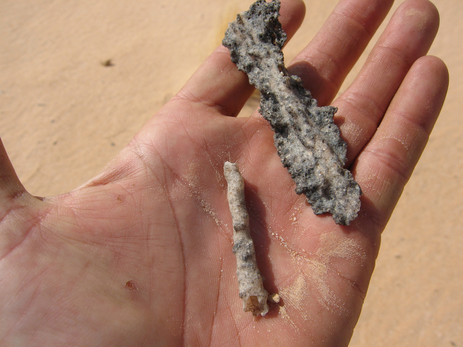 At just about every stop within the Empty Quarter, we easily found prehistoric artefacts and geological oddities lying near the camp. Among them were pieces of fulgarite – sand fused into delicate coral-like tubes or flakes of glass by lightening strikes. It’s something that never ceases to amaze me – solidified lightening. In Egypt we once found a rod of fulgarite as thick as my arm twisting deep into the sand in a shallow helix form created as the charge earthed itself.
