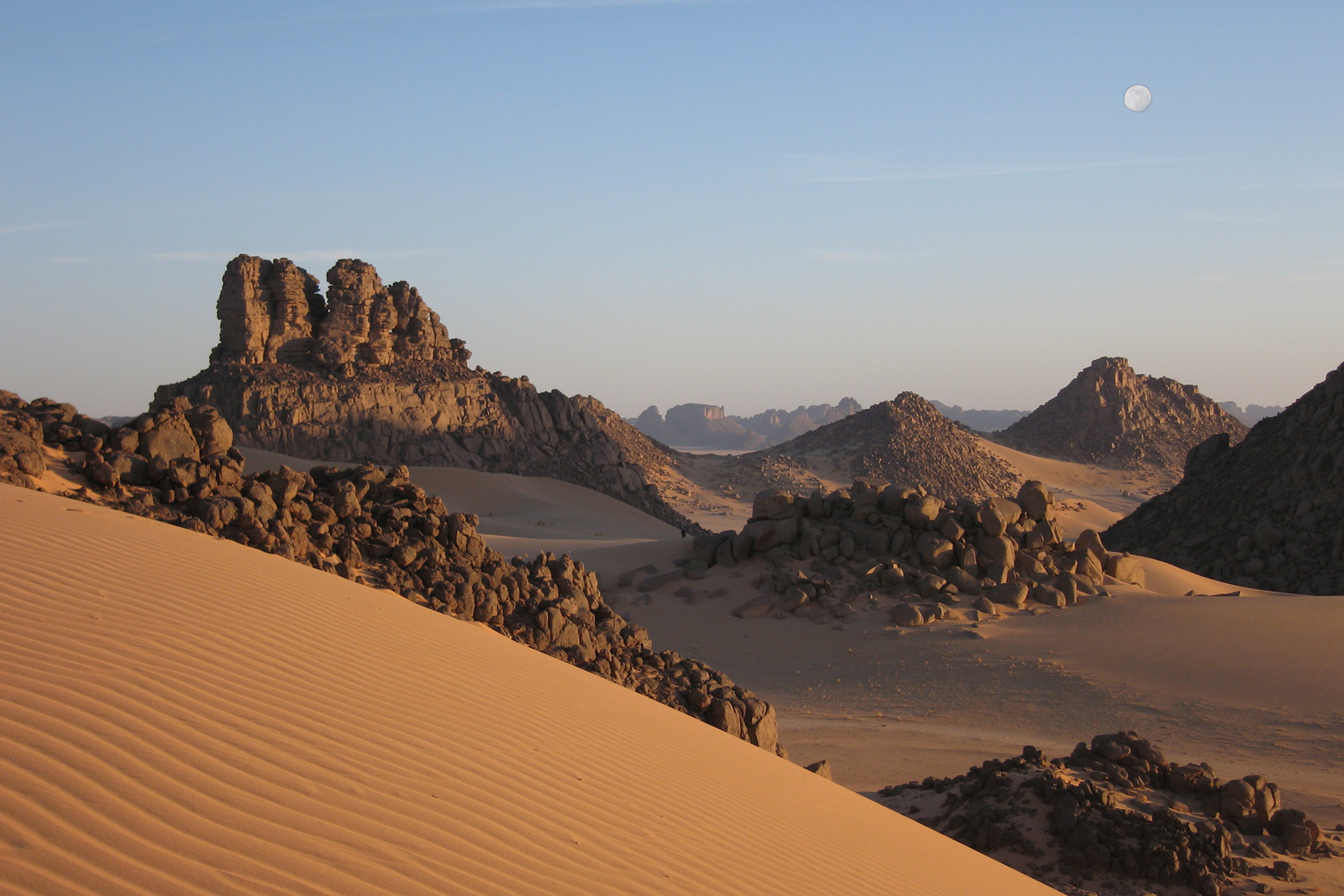 Next afternoon we passed the place where the truck had been ambushed on its way out, and later spotted our first tree since Ouadane in Mauritania. Soon rocky hills rose out of the unending sand sheet, heralding the outliers of the Jebel Timertine.