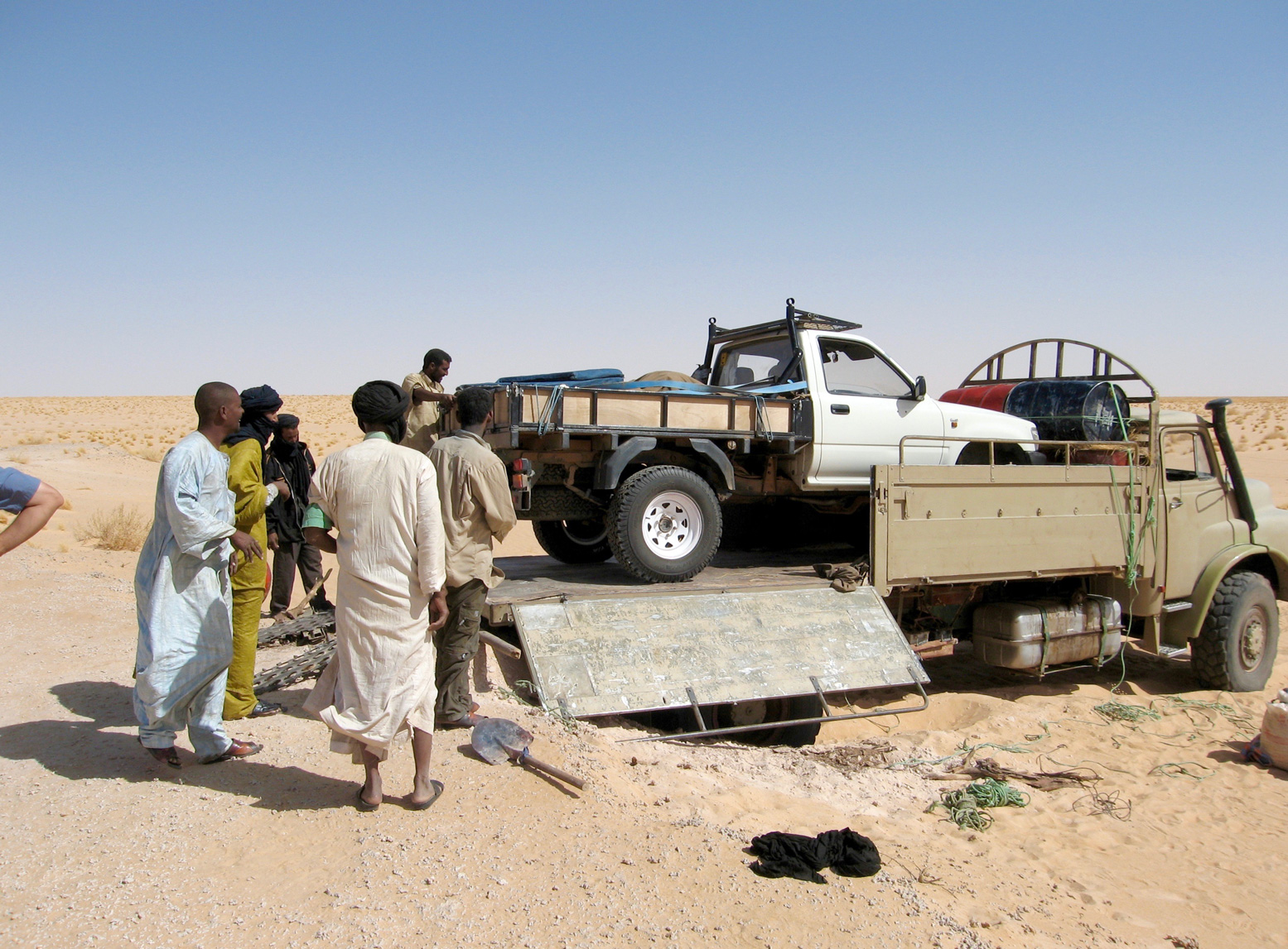 Inevitably we hit a soft patch and spent half an hour getting the running cars out before we could even turn our attention to the dead pickup with much digging and all the tow ropes joined together. But progress was good and by lunchtime next day we pulled up at 20°N 6°W to record the point for confluence.org, a website that’s collecting images and descriptions from every terrestrial longitude and latitude confluence on earth. Our shots to the four points of the compass were all interchangeable: blue sky over flat sand sheet whichever way you looked.